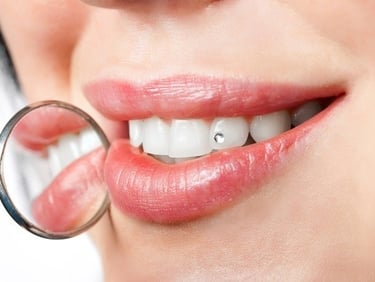Pemasangan aksesori diamond kecil pada permukaan gigi untuk tampilan unik dan stylish.
